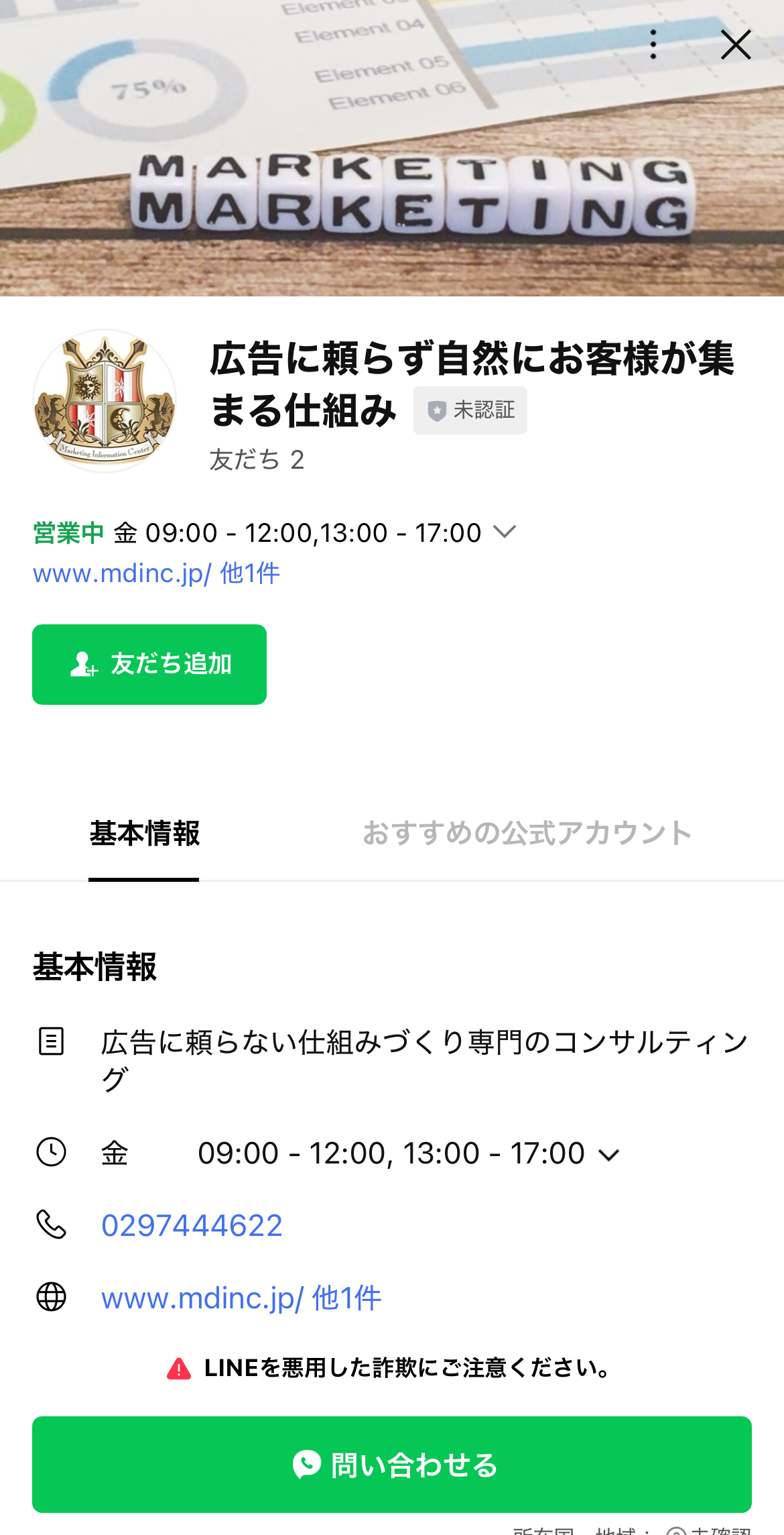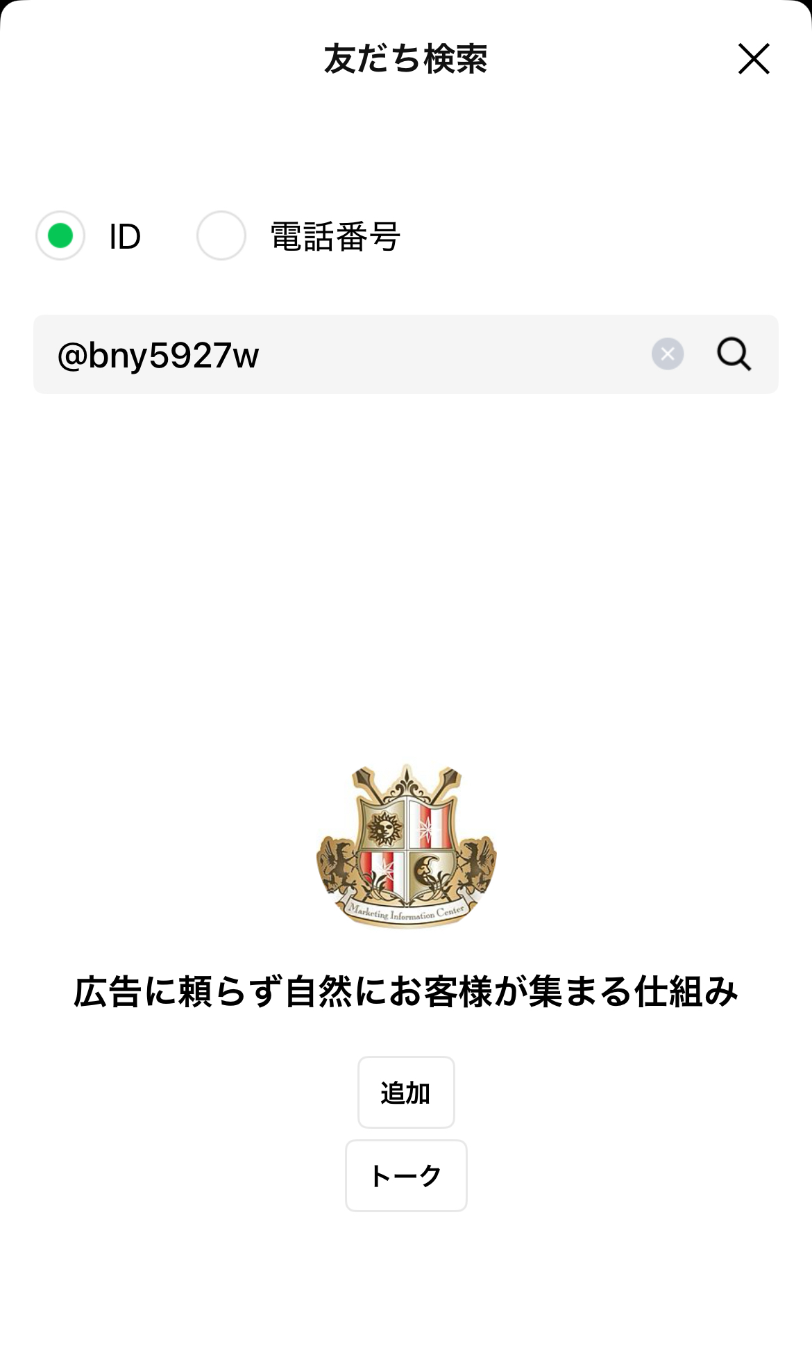 または、「友だち検索」からID:@bny5927wで検索いただくと以下のような画面が表示されますので、